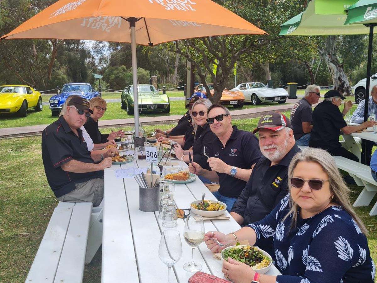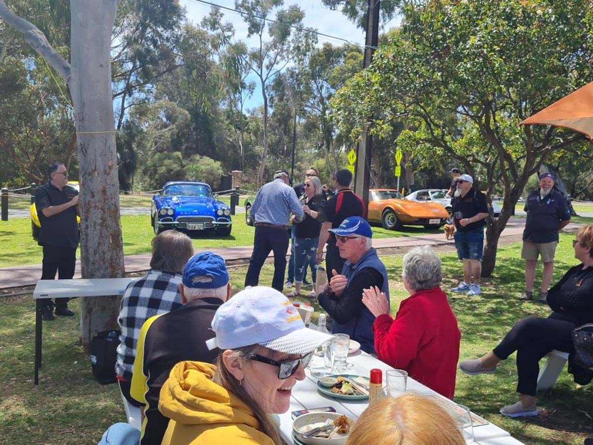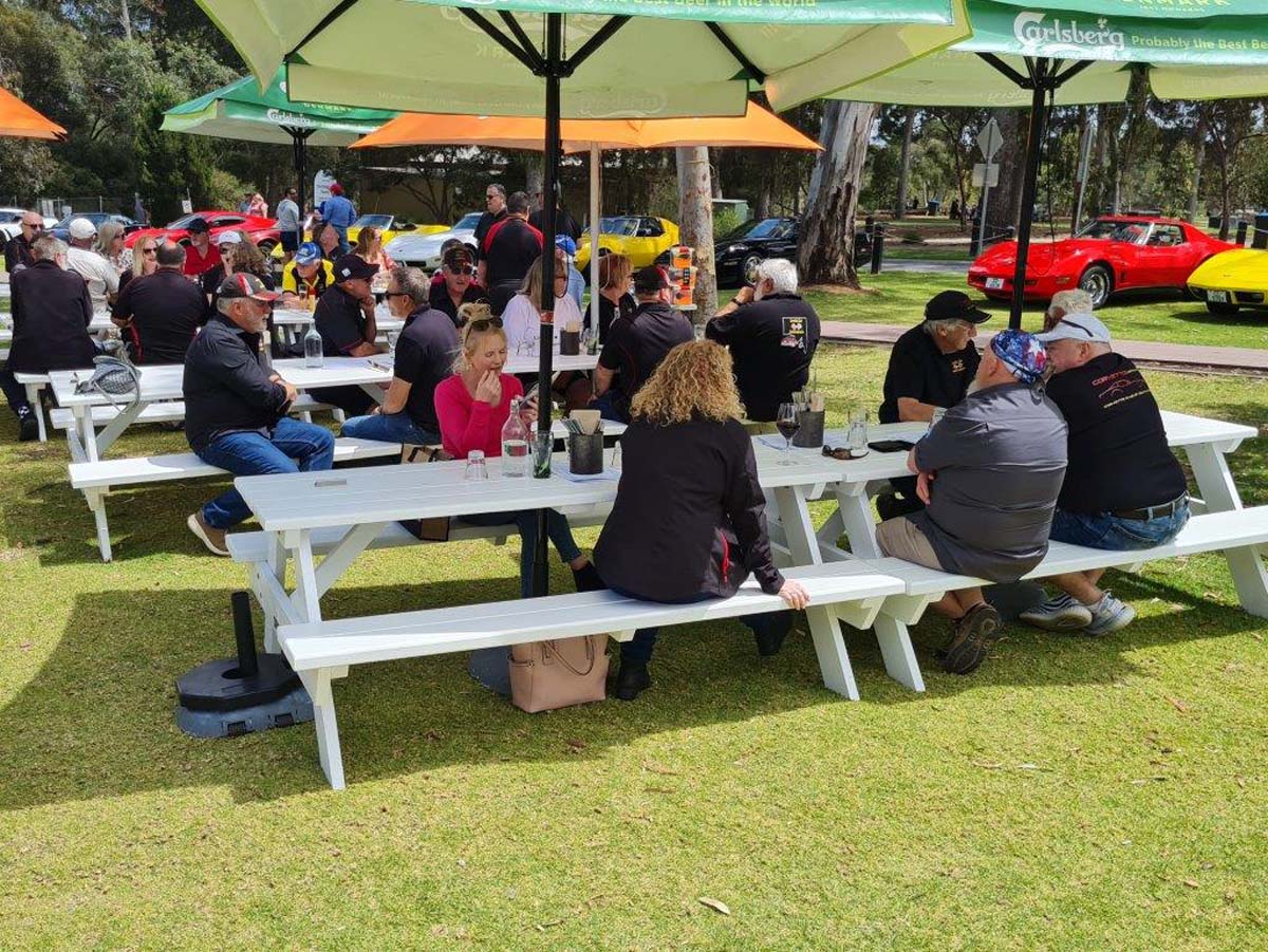 Picnic tables and umbrellas had been set up for us near our vehicles, under the shade of gumtrees for an enjoyable lunch and afternoon. Everyone grabbed a drink and staff came to our tables to take lunch orders. In the meantime, Fred the hotel owner had taken a real liking to a blue C8, so Ricky the owner was kind enough to take Fred for a drive, you couldn’t wipe the smile from his face, as it was his first time in a vette, and what a vette it is, thank you very much Ricky. I hear Fred has been scrolling the classifieds looking for a new “company” vehicle. Lunch arrived and was enjoyed by all, perfect weather and great company for a Sunday afternoon picnic amongst Corvettes overlooking Thorndon Park.