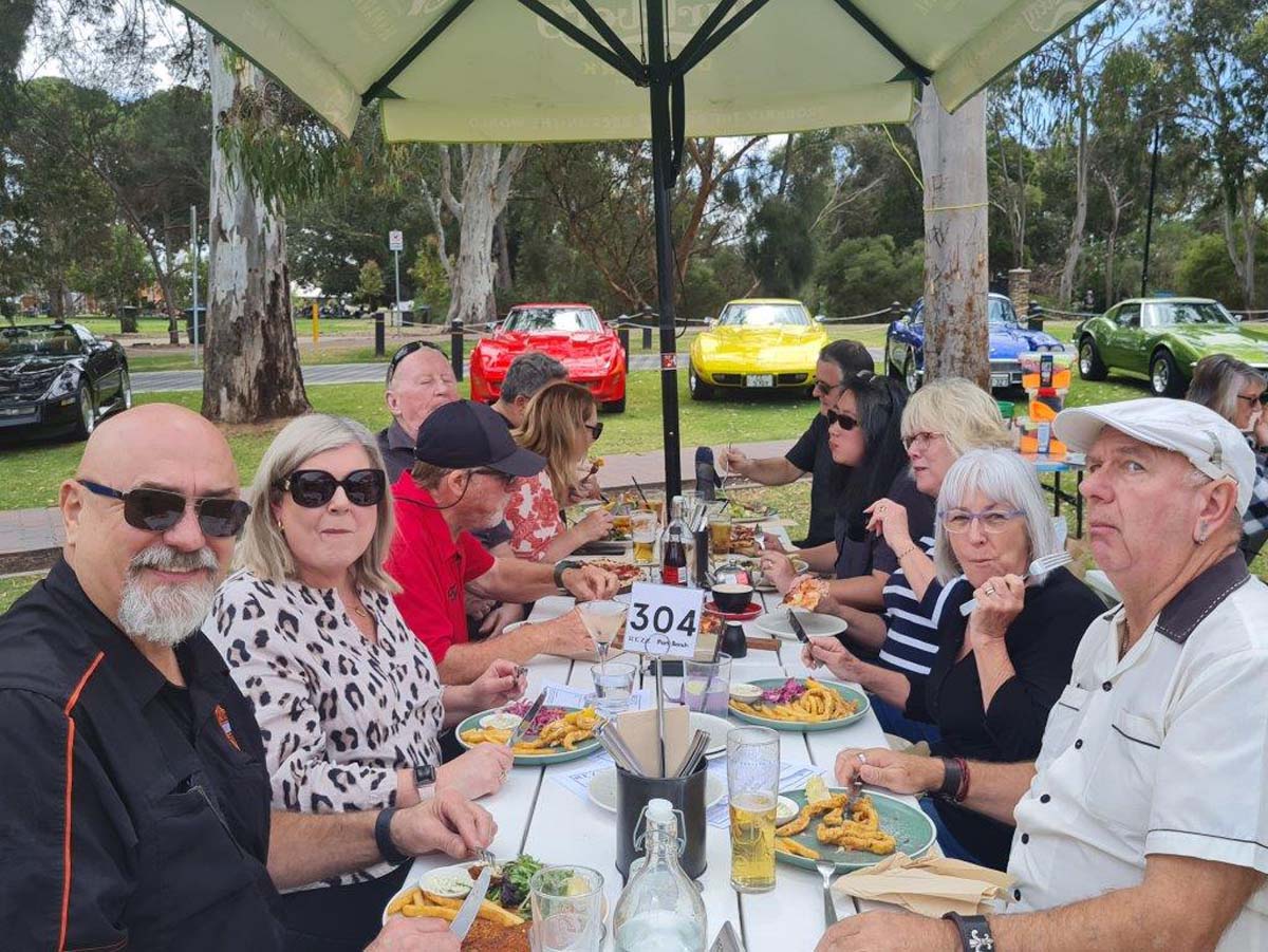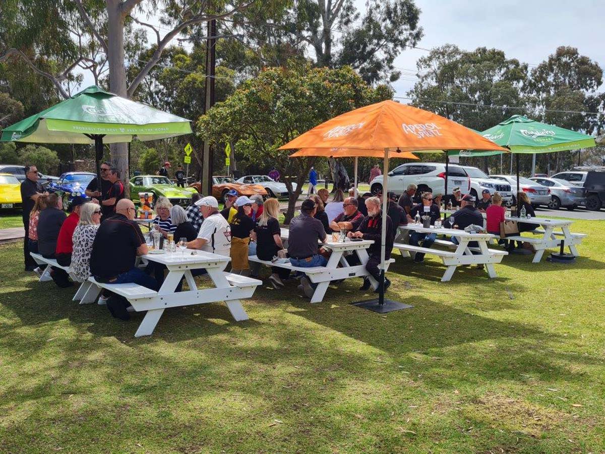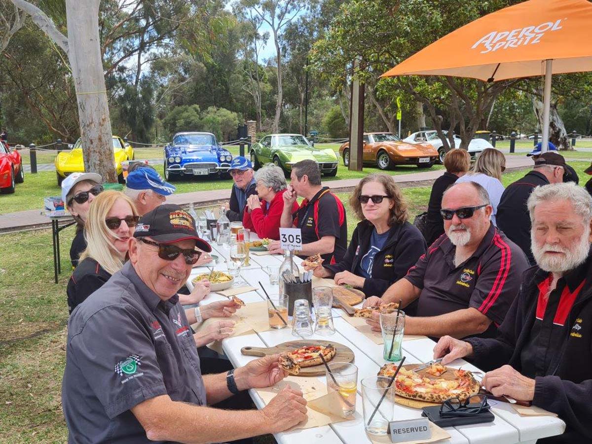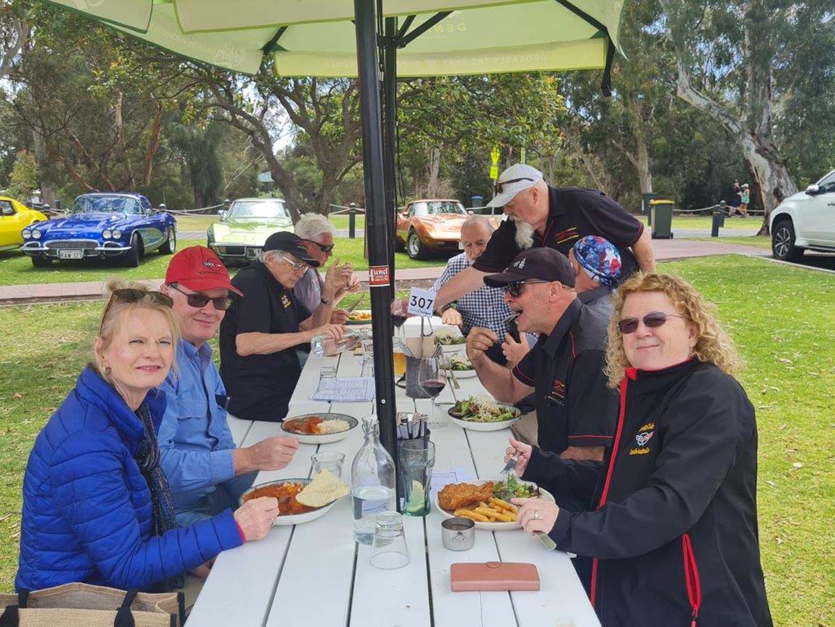Picnic tables and umbrellas had been set up for us near our vehicles, under the shade of gumtrees for an enjoyable lunch and afternoon. Everyone grabbed a drink and staff came to our tables to take lunch orders. In the meantime, Fred the hotel owner had taken a real liking to a blue C8, so Ricky the owner was kind enough to take Fred for a drive, you couldn’t wipe the smile from his face, as it was his first time in a vette, and what a vette it is, thank you very much Ricky. I hear Fred has been scrolling the classifieds looking for a new “company” vehicle. Lunch arrived and was enjoyed by all, perfect weather and great company for a Sunday afternoon picnic amongst Corvettes overlooking Thorndon Park.