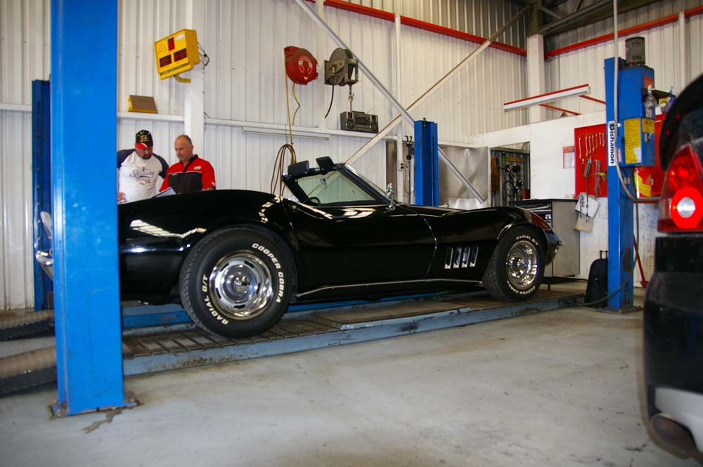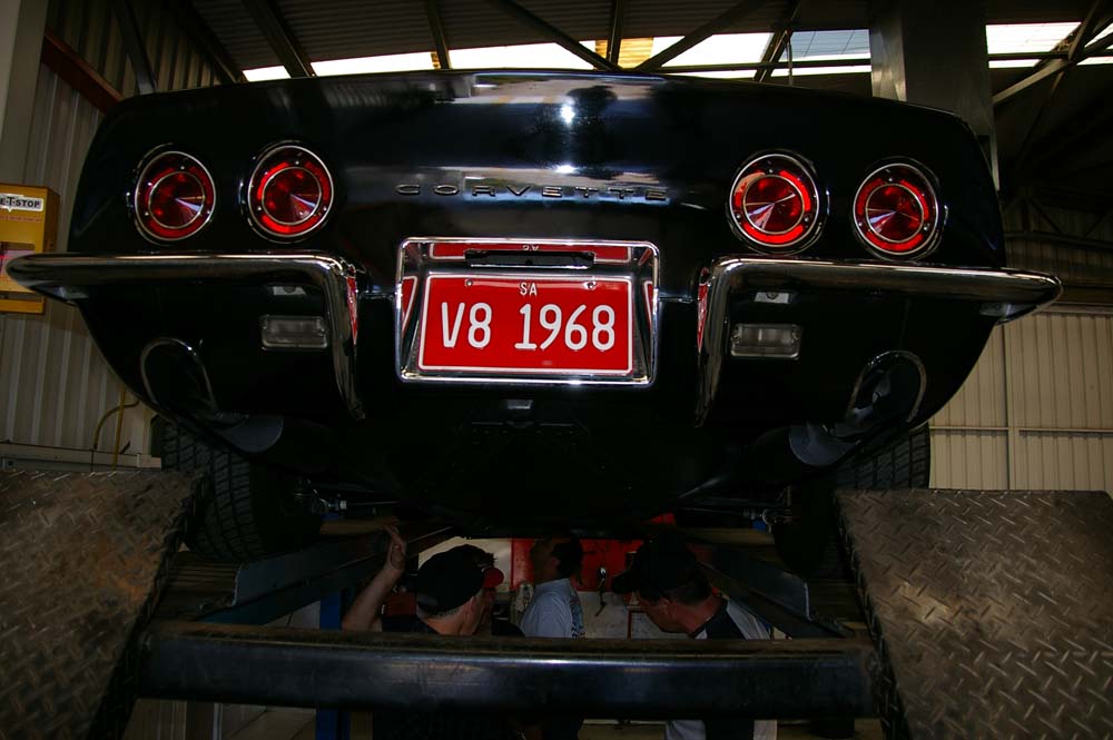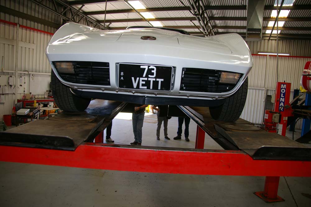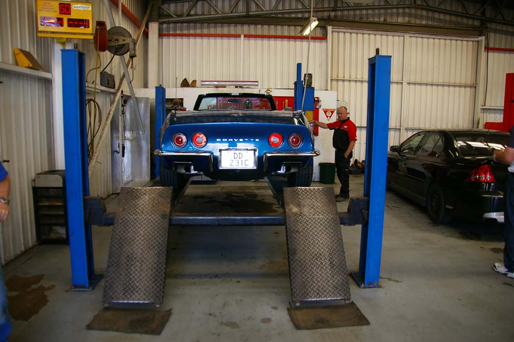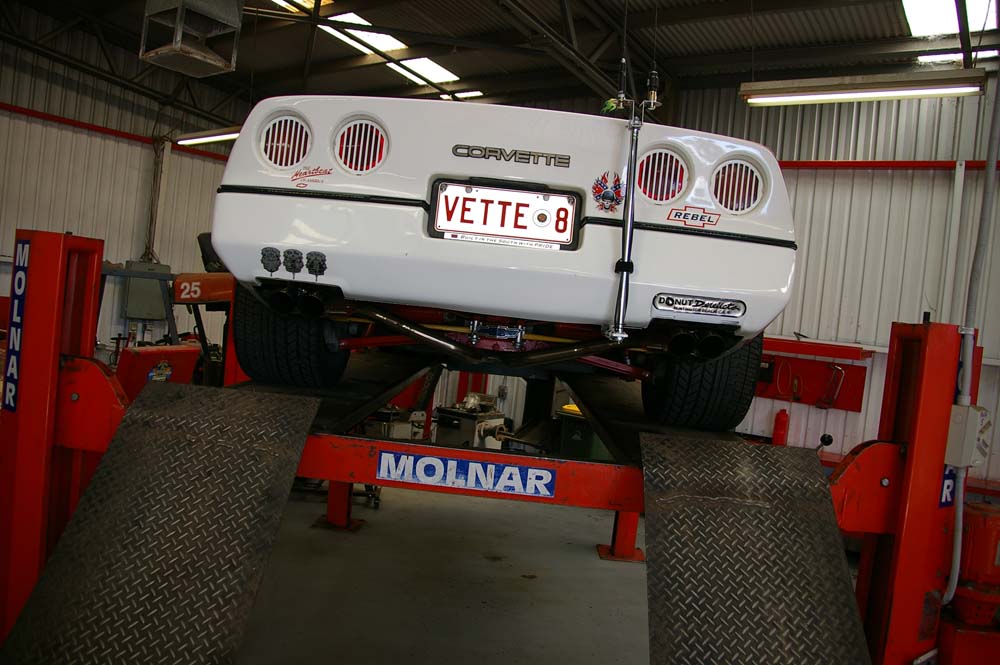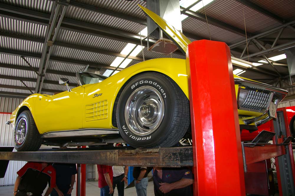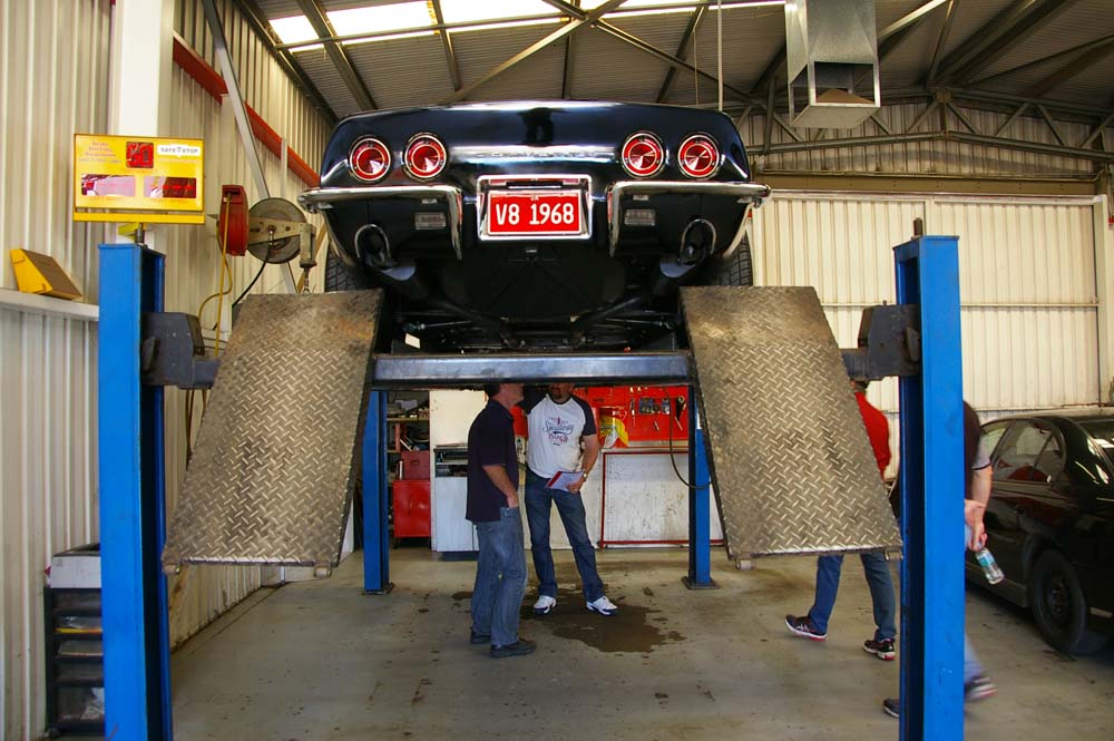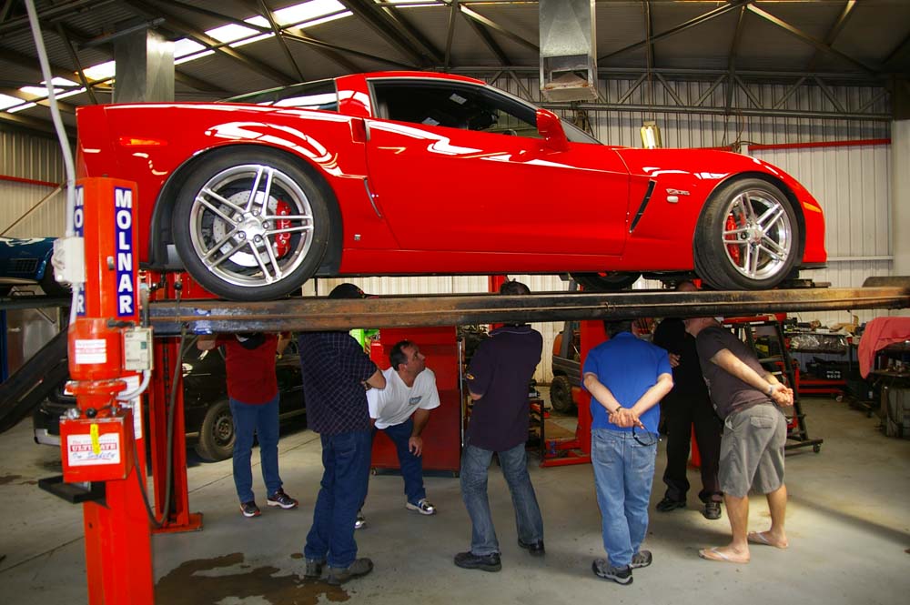 Thanks to Nathan at The Engine Bay the Corvette Club was able to take our vettes down & for those who do not have a hoist were able to get our cars up & check it out.